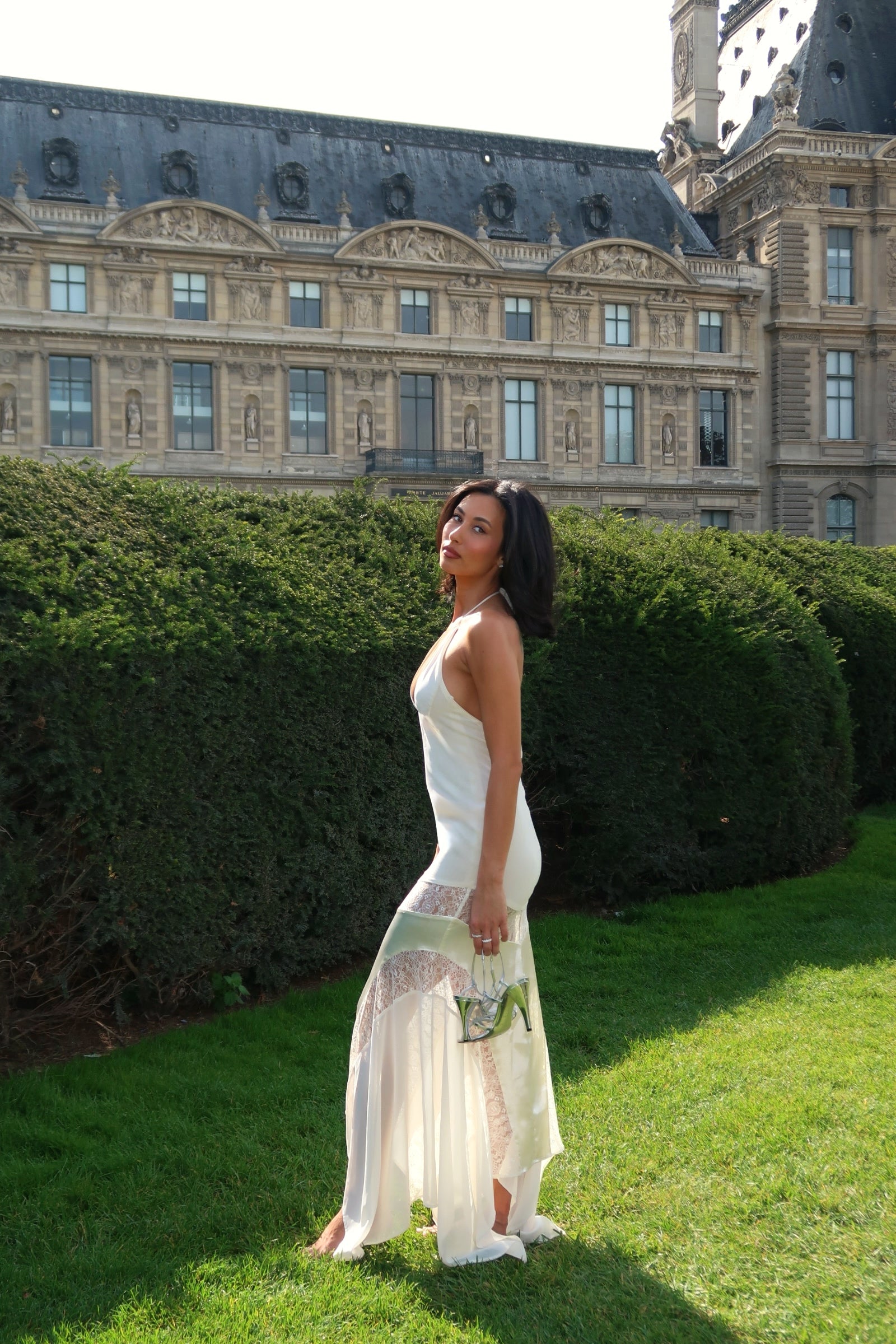 Crafted in a soft opal shade, this lightweight, silky slip features a double-layered detail at the bodice that drapes beautifully over the body, creating an effortlessly elegant silhouette with a subtle sheen. Designed for any occasion, from quiet mornings to evening events, this piece is made for the woman who values simplicity, versatility, and refined style.