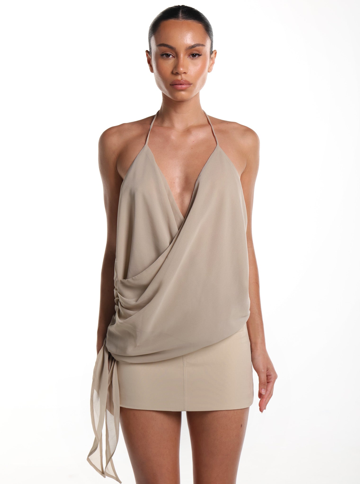 The Rue top in desert Sand combines soft, organic textures with a relaxed, versatile silhouette, perfect for effortless styling.